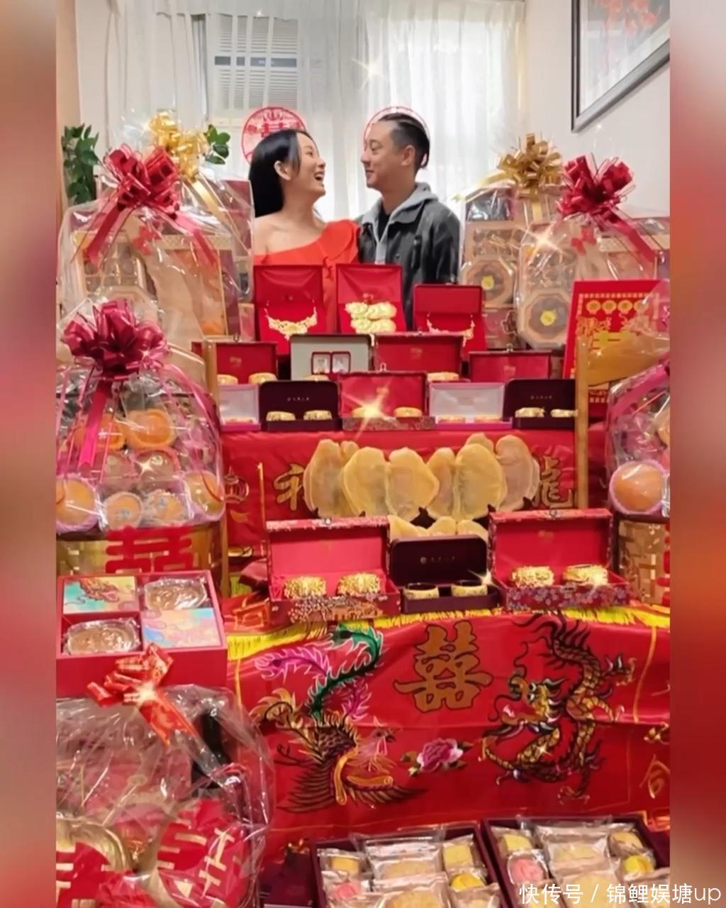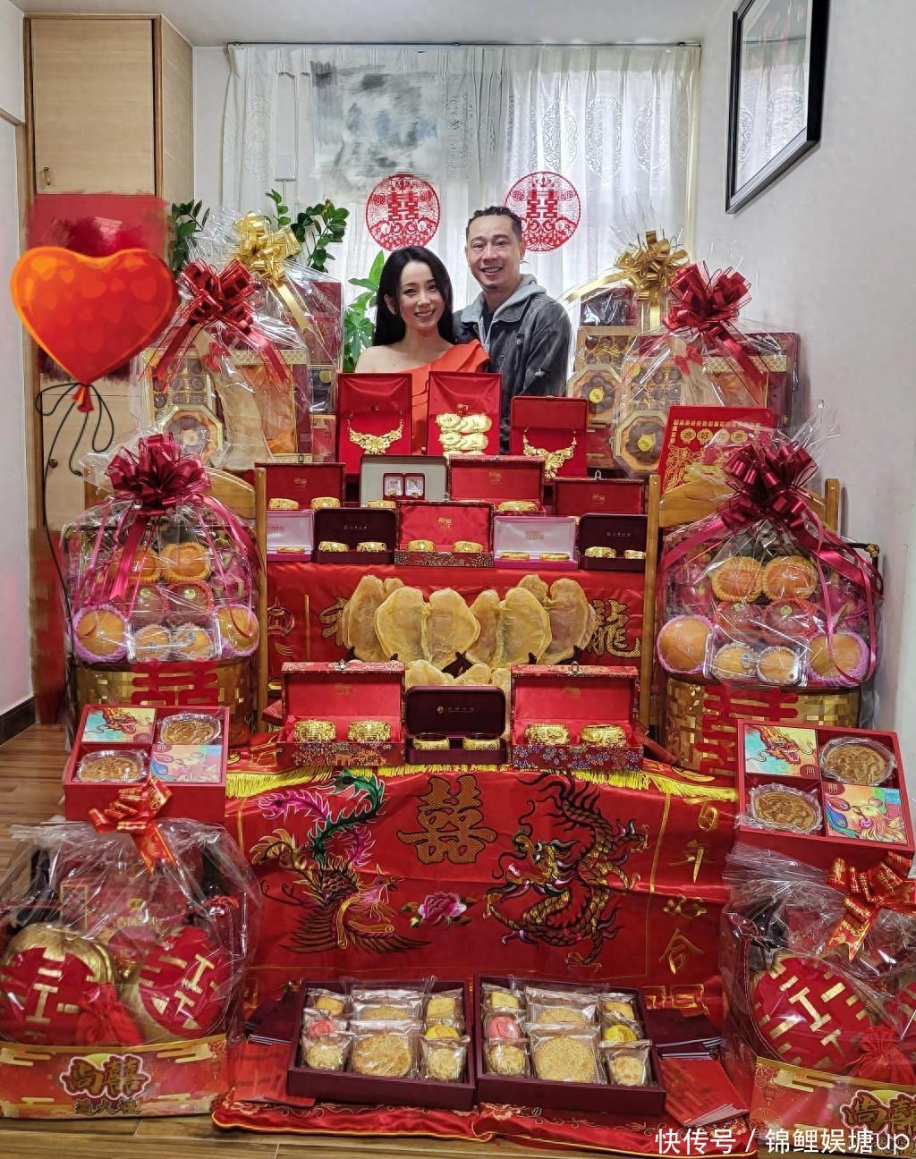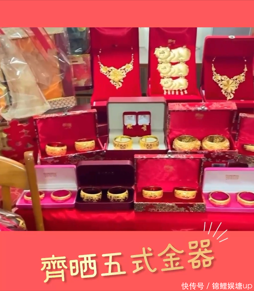 相片见当日过大礼的用品摆满悉数这个词客厅,有八个大礼篮,鲍参翅肚全皆,更有比脸更大的心型花胶。 至于金器更是夸张,有金链、金猪牌、耳饰、龙凤手镯等五金,其中有12对龙凤手镯,不少皆拳头般大,金光闪闪,止境扎眼!