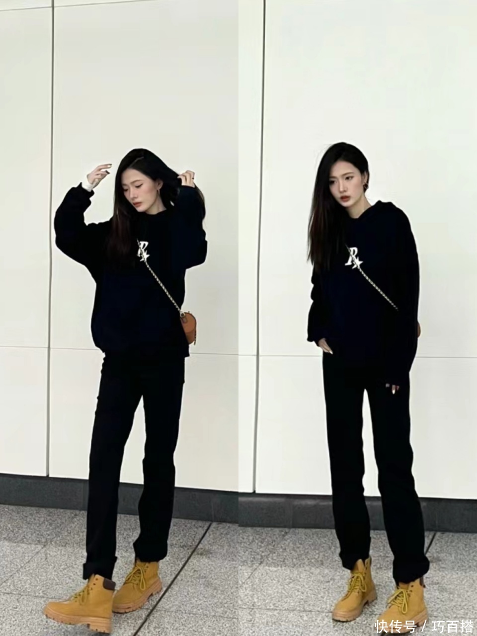 有了玄色长裤的加握,咱们不错五分钟料理整套造型,浮松一件卫衣和羽绒服与之搭配,都能跋扈外穿外出的需求。